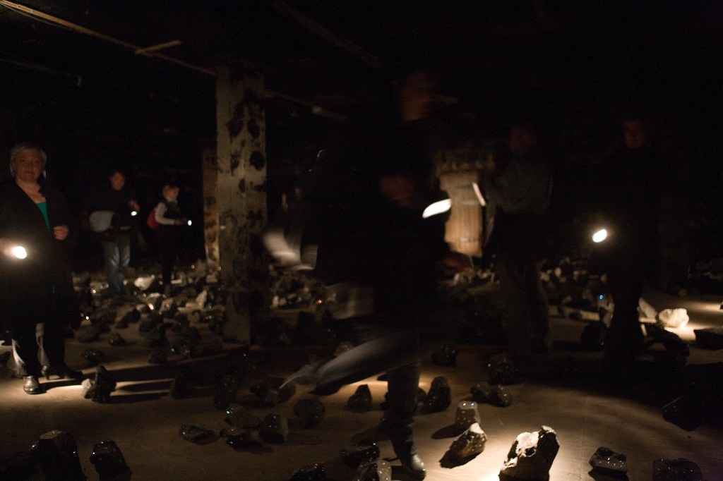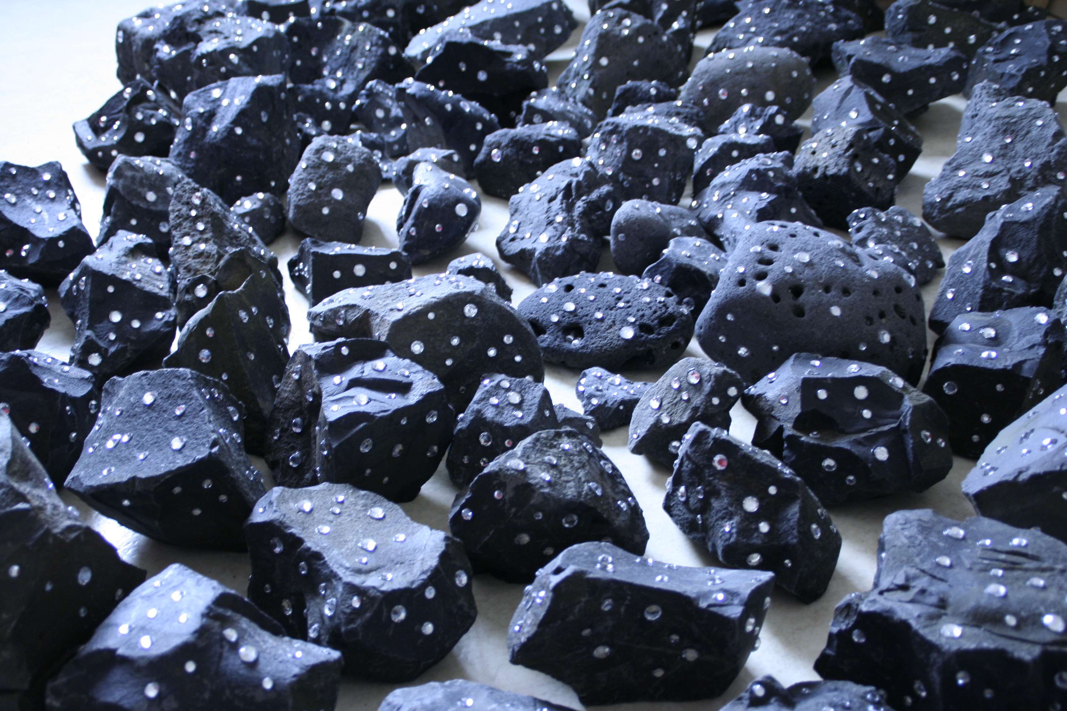 1001 black stones, each set with crystal beads 23,250 in total, are scattered irregularly across a 250 m² floor. The space is dark; visitors are given a flashlight but must enter at their own risk.