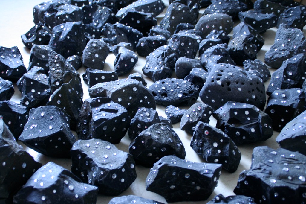 As they move slowly through the vast room, the stones glitter and glow like a diamond cave, evoking both wonder and unease. The work reflects nature’s magic and force, its cycles of destruction and renewal transforming the environment into a site of enchantment and confrontation.