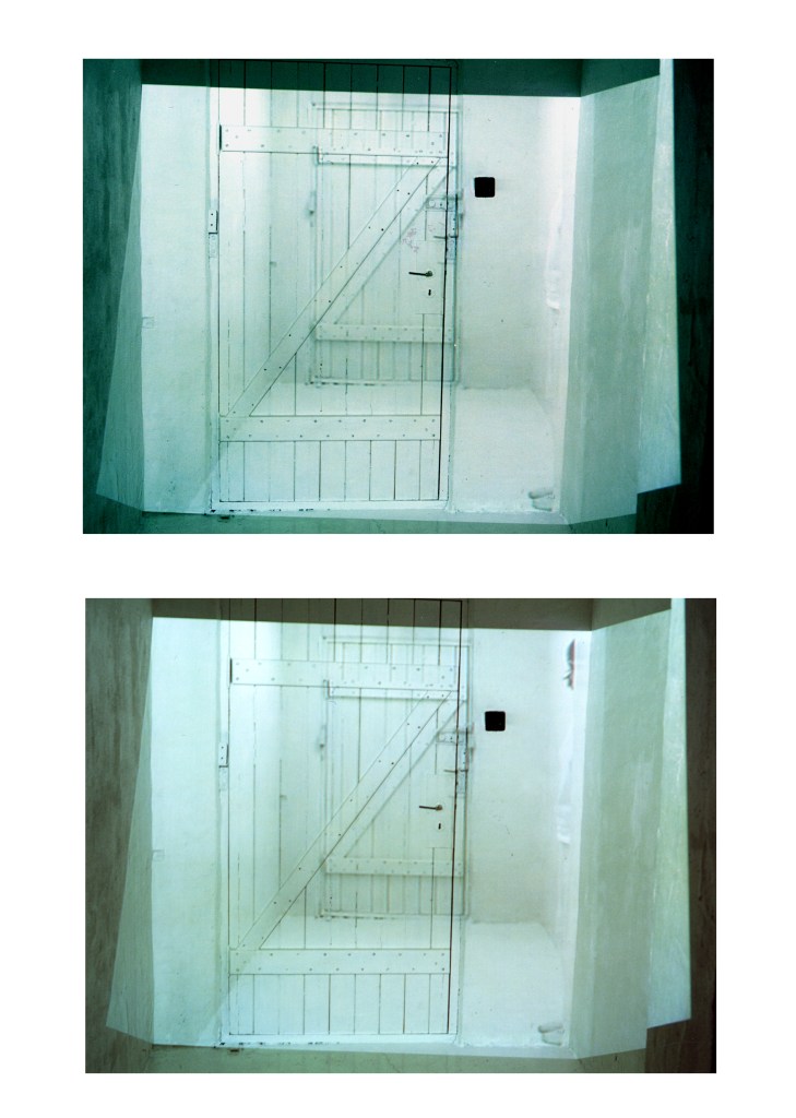 A life-size, site-specific video shows a figure hiding behind a column, peeking out from time to time. Now and then she jumps to the light switch on the wall, turning the room dark. Moments later she switches the lights back on and quickly jump’s behind the column again. For a moment, viewers may be unsure whether the figure is present in the space itself.