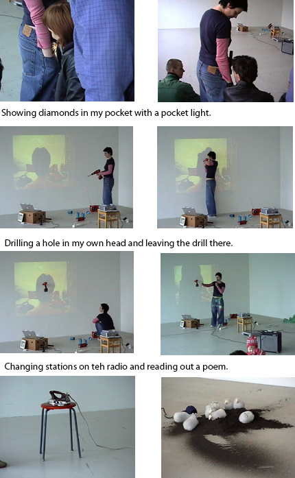 In this performance, I mix fragments of ideas from many different performances to create a new one. I use a lot of objects, props, sound, video, music, and I recite text and short poems of my own.