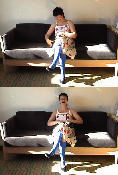 A woman sits on a sofa with her handbag. At first she giggles quietly, then little by little the laughter becomes louder. In the end she breaks into loud bursts of laughter. After a while, she stands and walks away.